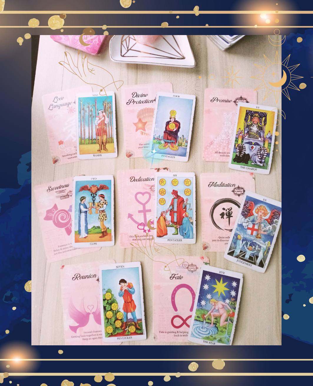 Before your readings, I connect with guides angels, and engage in a heartspace meditation. My reading space embodies a romantic theme for love readings, featuring oracle & Tarot & gypsy cards with a pink aesthetic. I select decks for your session with intuition and care.